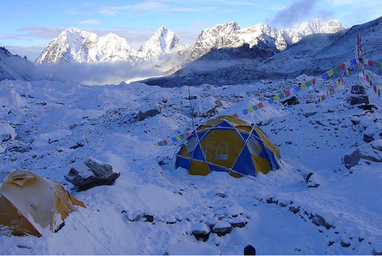 Spring happens to be one of the best times of the year to visit the Everest region, although because of this, it can become somewhat crowded. One can meet many other Everest climbers during this season and base camp is full of tents. The beautiful clear blue sky can be seen and the many different species of flower are visible in the lower altitude.