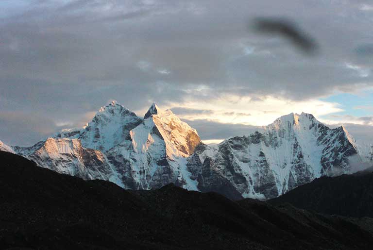 After meeting all your team and crew in Kathmandu we fly by helicopter or fixed wing plane directly to Lukla and follow the Khumbu Valley to Namche Bazar. Acclimatizing along the way and relishing in the hospitality provided by our Sherpa friends we reach base camp and after some rest and preparation we begin the ascent. Base camp will be a collection of sleeping tents, as well as a large kitchen and dining tent. We utilize the services of specially trained Sherpa cooks and we import a lot of high quality food to supplement the local produce available. The guides and Sherpas will fix rope on the route and stock the camps with provisions and equipment. By utilizing fixed rope we can climb in average weather, and, if necessary descend to base camp with little problem in case of a major storm. Two or three climbing Sherpas will assist with the load carrying but no more will be engaged in order to avoid clogging the route and spoiling the nature of the climb. When the fixed line is in place, and the two camps are established and stocked, we will climb back up the ropes and make a bid for the summit. Sufficient supplies will be available to support all members. Guides and Sherpas will carry all group gear but members are expected to carry their own personal gear. Radios will be used to co-ordinate the movements on the mountain and provide a safety back-up for the lead team.
